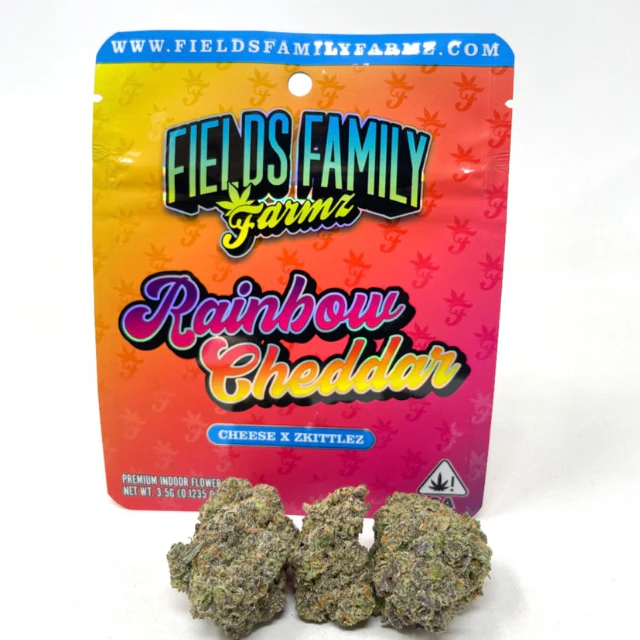 Rainbow Cheddar is created through crossing the potent Zkittlez X Cheese strains. This potent combination yields a delicious flavor and interesting effects that will first energize the mind before knocking you flat on your back. You'll feel the mental effects hit you in the forehead and behind the eyes pretty quickly, lifting your cerebral state into one of pure energy and focus. However, this focus will soon turn heady and hazy, leaving you fading in and out of reality but with a big smile on your face.