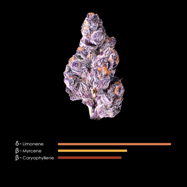 Panta Rhei is a dynamic cross of our Blue Agape #9 and Oro, with midnight purple buds, fiery orange hairs, and glimmering trichomes resembling the brink of twilight. This strain's evolution in flavor and aroma embodies the ancient Greek philosophy "everything flows," offering a journey of sensory expansion that shifts from sweet, gentle earth tones into a resonant blend of evergreen, citrus fruit, and gas. This transformative Indica is an ode to the beauty of change and encourages one to find the balance between stillness and movement.