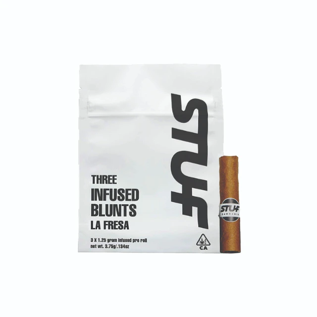 La Fresa is a Sativa Leaning Hybrid. Our Three Infused Blunts pack features 3 individual 1.25 gram blunts, each blunt is made up of 1 gram of whole flower and .25 grams of live resin. Stuf blunts are hand rolled in a pure hemp wrap with a high gauge glass tip for an ideal pull and flavor. All 3 blunts come in pop top tubes housed within a child safe resealable pouch.
